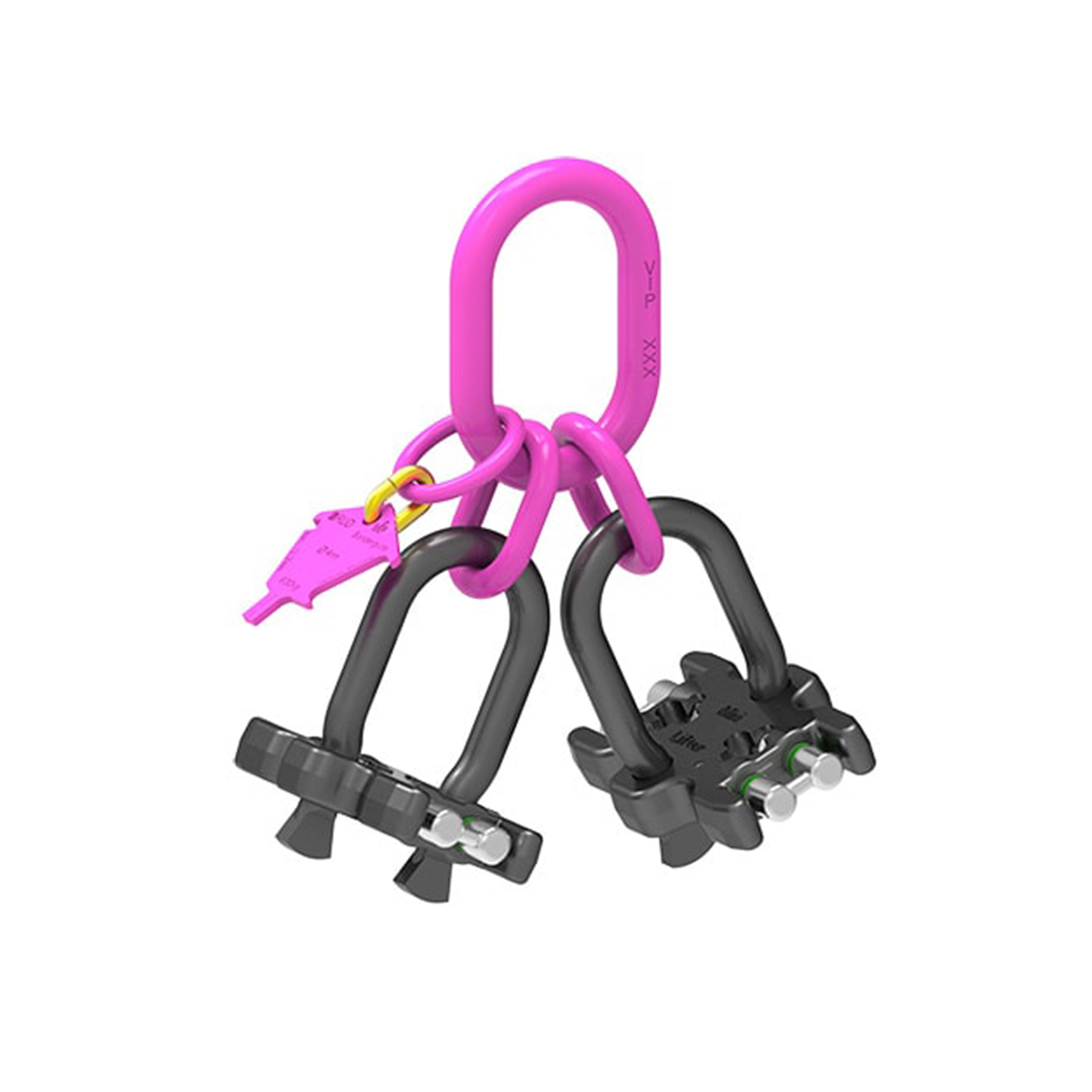 Master link with an integrated shortening option specially developed for the 4mm VIP lifting chain. With the pressing of the locking bolt the chain crucifix is freed and the chain can be mounted and respectively be adjusted to the desired length. Ideal for small loads up to 880 kg (in a 2- leg application).