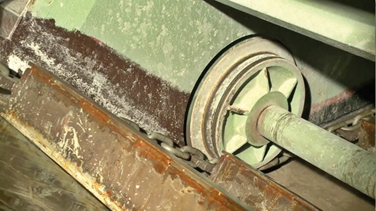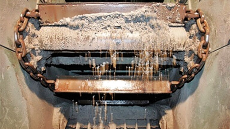 A typical SSC uses a continuous wear resistant round case hardened steel link chain with scraper bars fitted with multilink attachments that travel along the floor of a steel trough filled with water. Ash is conveyed by an upper strand in the water filled tub. As the scraper bars move the ash toward the outlet, the trough’s inclined section raises the material out of the bath for discharge. Chains run over idlers, shafts and submerged overhung idlers (SOI). SOI are partly equipped with control facilities to monitor the operation and is a critical component in the system.